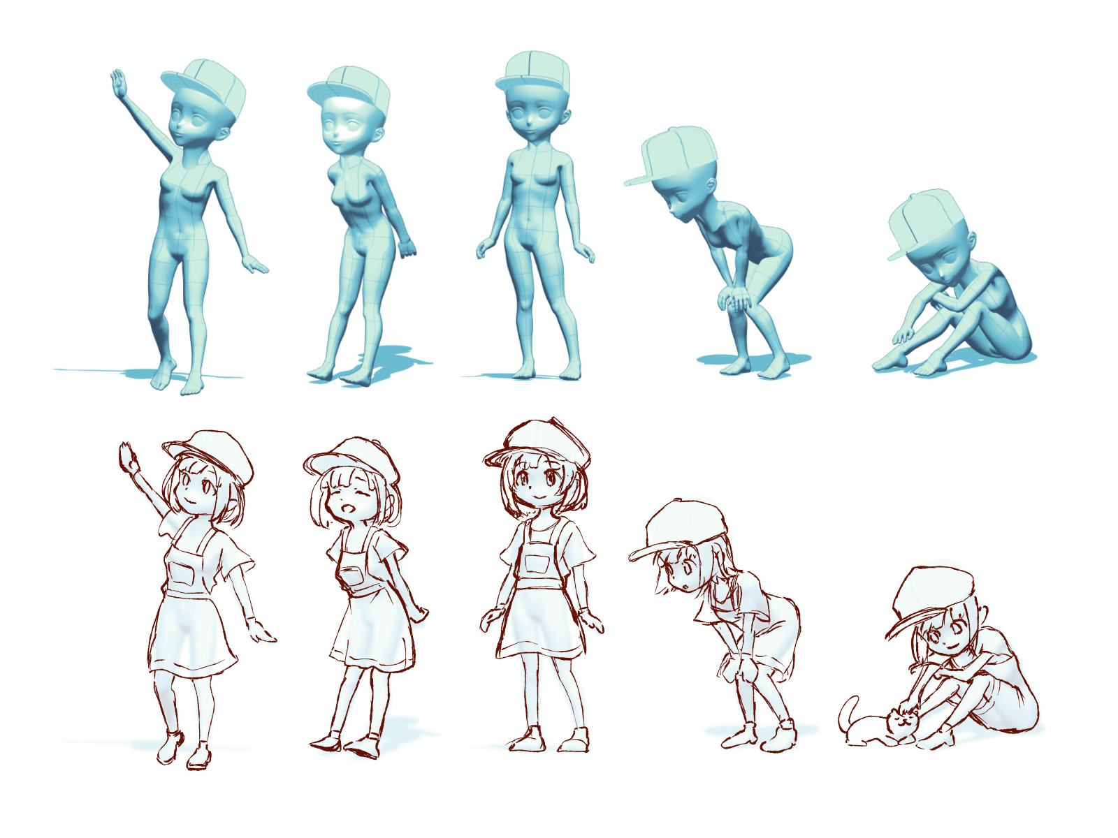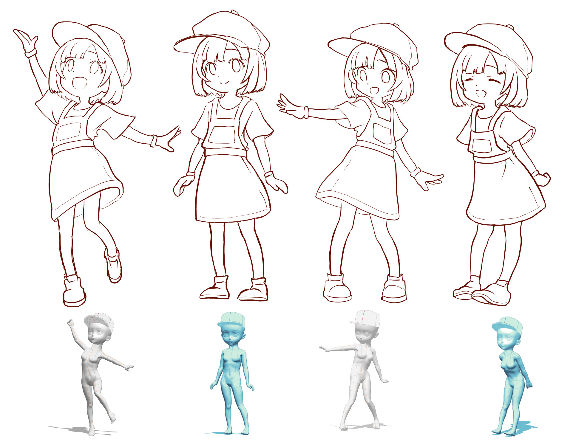 最近はゲームに使う用のキャラ絵 (同一キャラが複数のポーズをとる) を、 3D デッサン人形をベースにして描くということをやっていた: